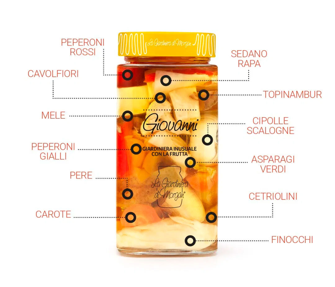 Le verdure inusuali di questa ricetta variano con le stagioni e sono accompagnate dalla dolcezza della frutta. Dopo la maturazione in agrodolce vengono conservate in in olio extravergine di oliva e olio di semi di girasole.
